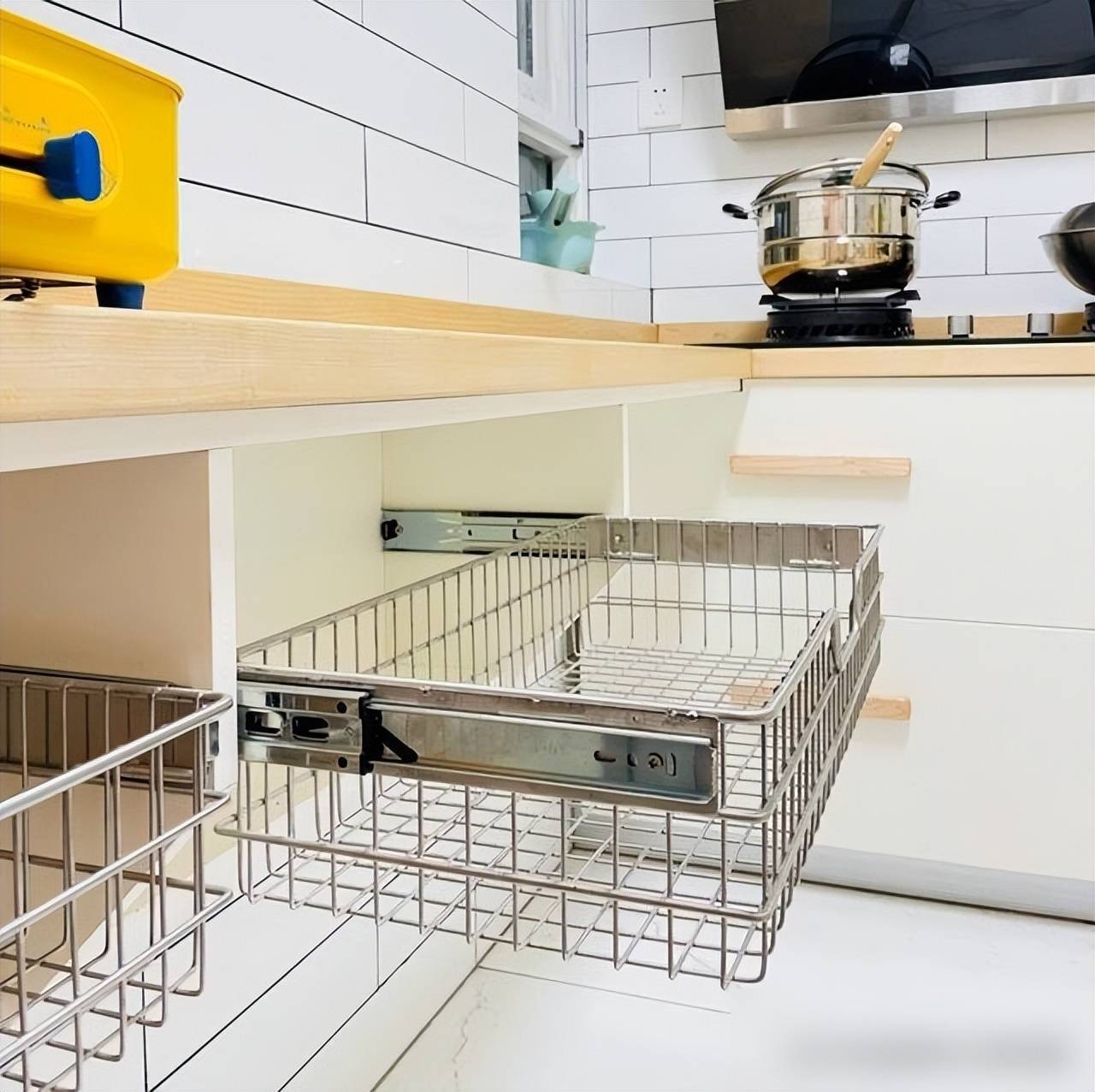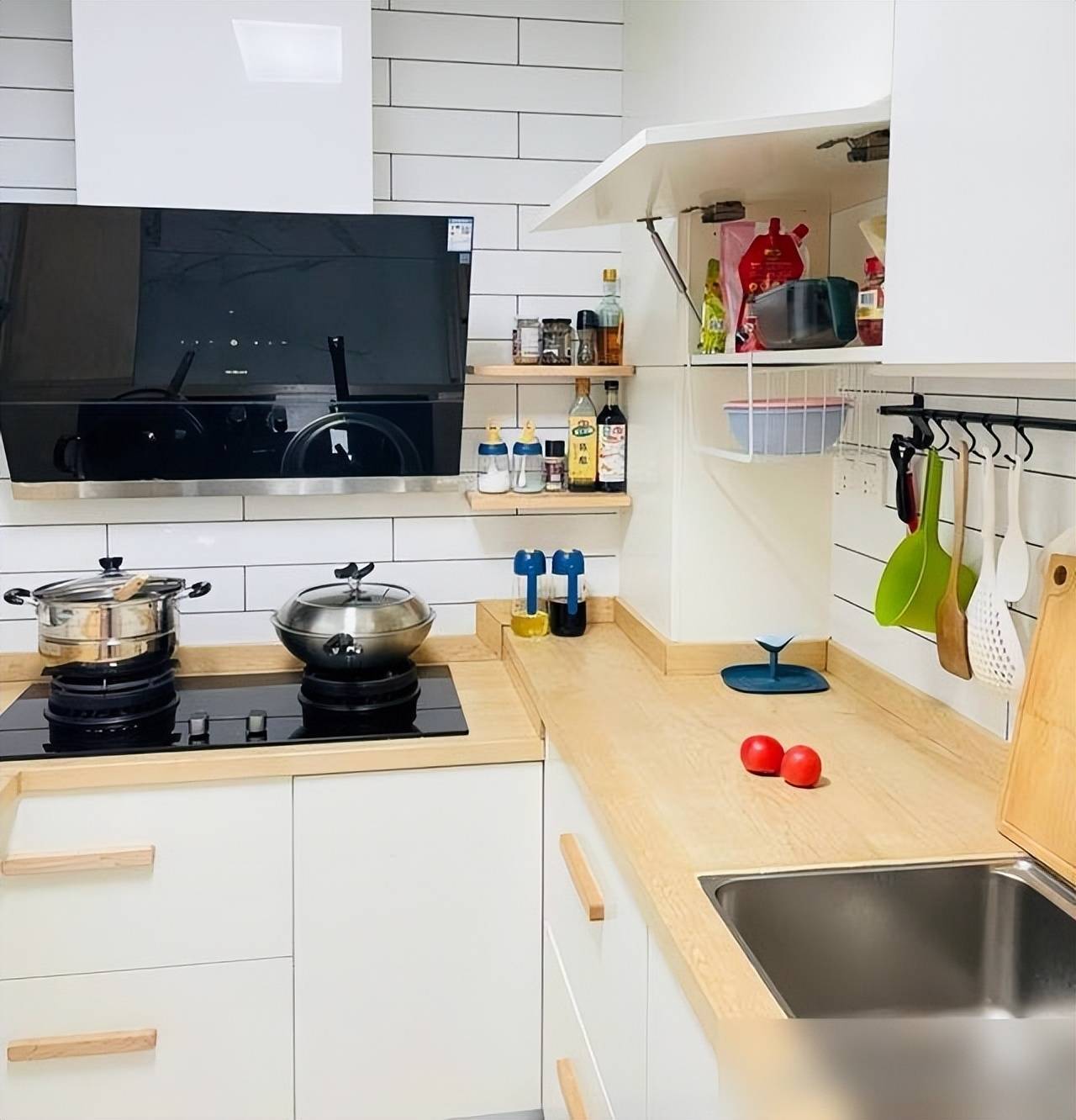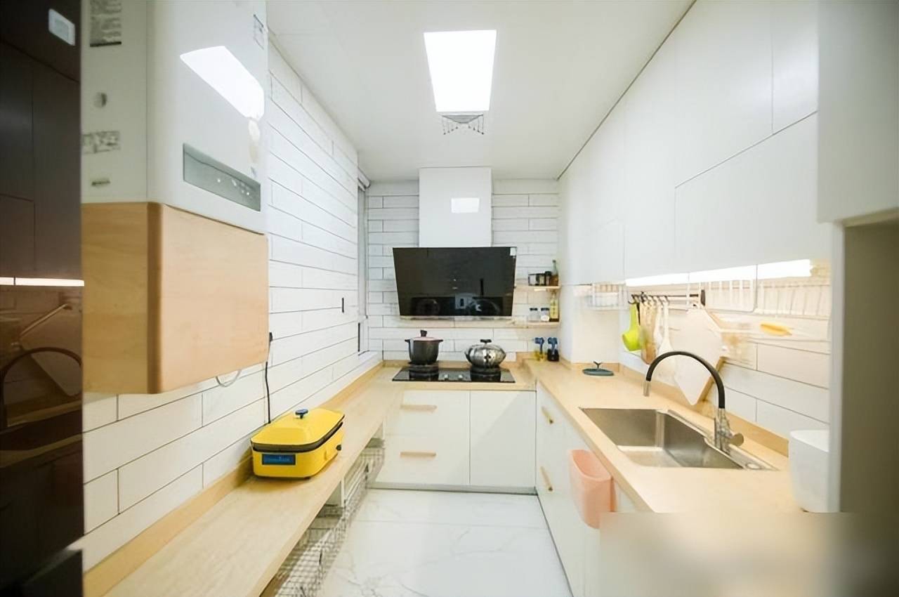 再说说厨房的设计,简直是 “做饭人的救星”!U型布局把切菜、炒菜、洗碗区分得清清楚楚,高低台设计——切菜区高1米 (妈妈切菜不用弯腰),炒菜区低80厘米 (爸爸颠锅不累),是不是比你家那种 “一刀切”的台面贴心十倍?