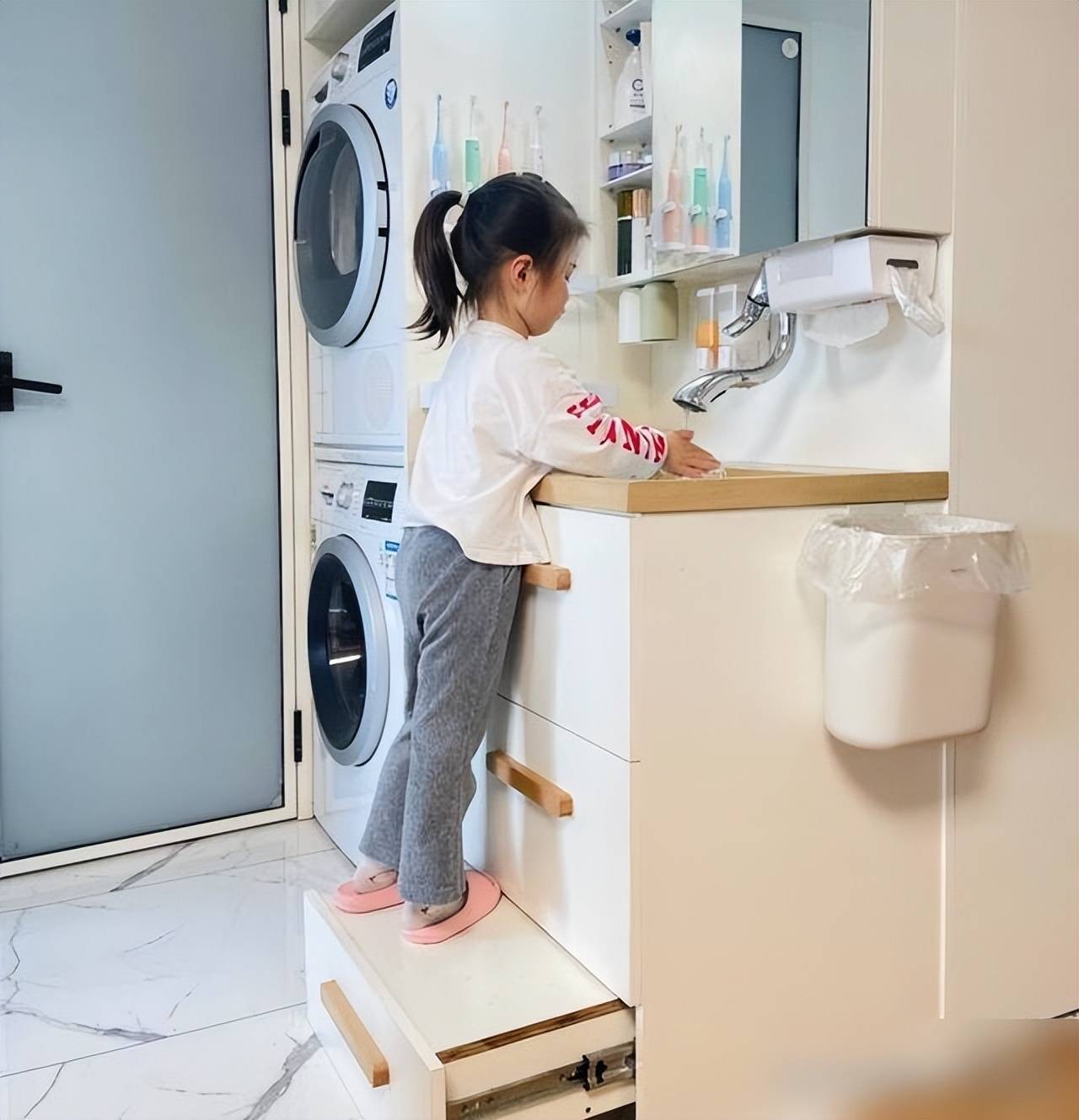 卫生间 的细节更绝:洗手池下面 的抽屉拉出来就是小凳子,孩 子洗漱不用踮脚;吊装水龙头不会撞到头,自动吹风机一吹就干;洗衣机+烘干机套装,没有阳台也不用把衣服挂得到处都是.你家是不是还在为 “孩子洗漱踮脚 ”发愁?是不是还在为 “没地晒衣服 ”焦虑?看看人家这操作,是不是 “花小钱解决大问题”?