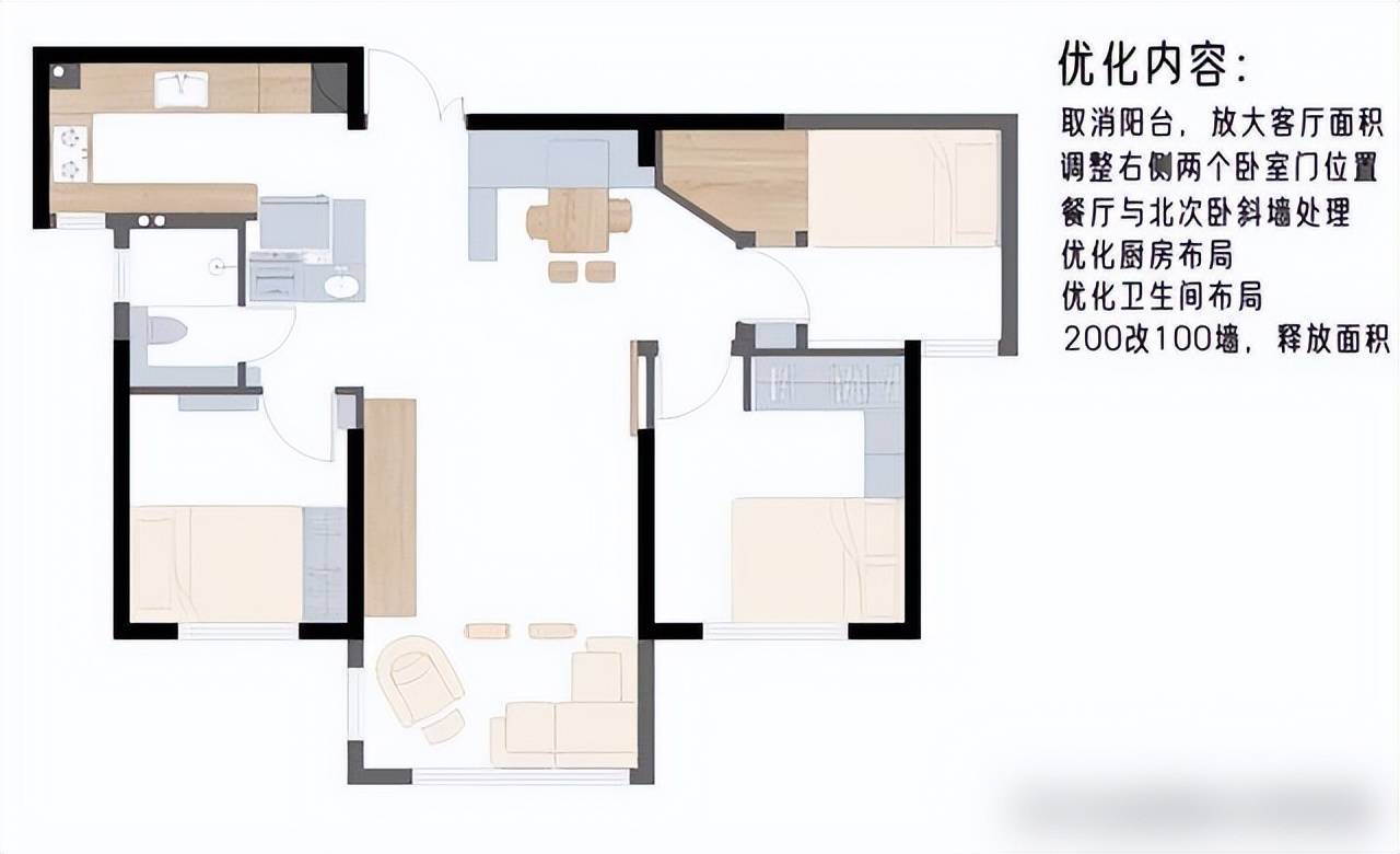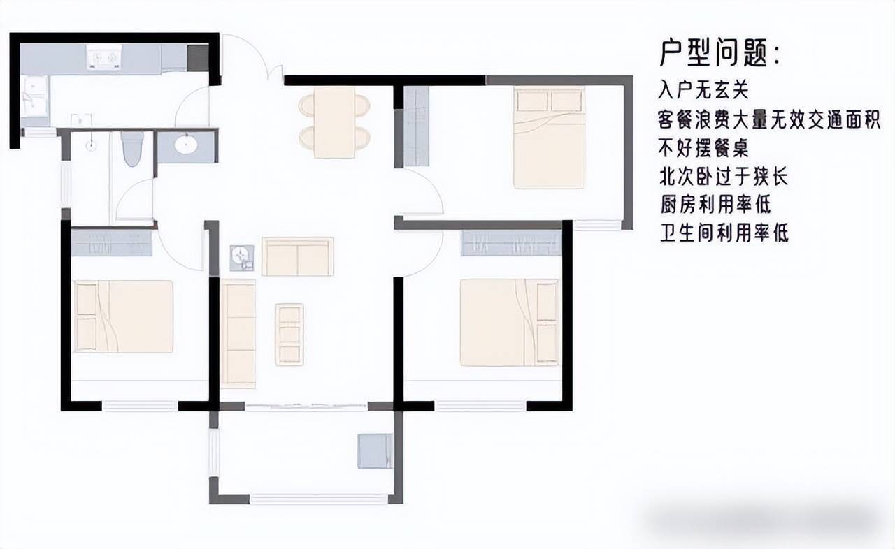 没玄关,鞋子堆在门口像“鞋山”,出门找钥匙得翻三分钟;客餐厅看着大,其实都是“无效空间”,餐厅小得连四人桌都放不下,想全家吃个热饭得把菜端到沙发上;北侧次卧长得像“走廊”,放张床都得侧着进,孩子写作业只能蹲在飘窗上;厨房卫生间挤得转不开身,做饭时切菜得“躲”着冰箱,洗漱得“抢”水龙头……这些问题是不是戳中你了?